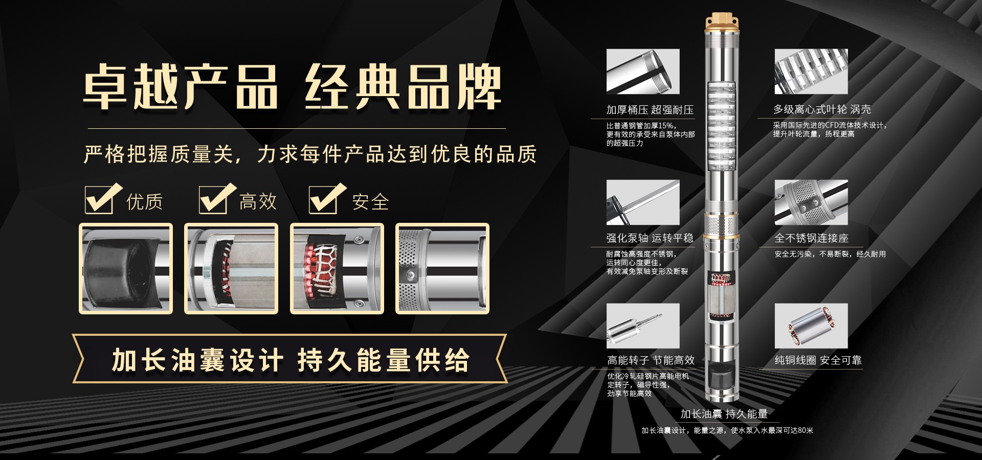 公司始終站在深井泵行業(yè)的前端位置,科研力量、產(chǎn)品和設(shè)備技術(shù)水平均達到國內(nèi)優(yōu)質(zhì)水平,公司始終堅持走科技興企、自主創(chuàng)新的企業(yè)發(fā)展之路,產(chǎn)品不斷推陳出新,可廣泛應(yīng)用于農(nóng)業(yè)灌溉、生活用水、循環(huán)供暖、污水處理、市政供水、石油化工、冶金礦山等領(lǐng)域。